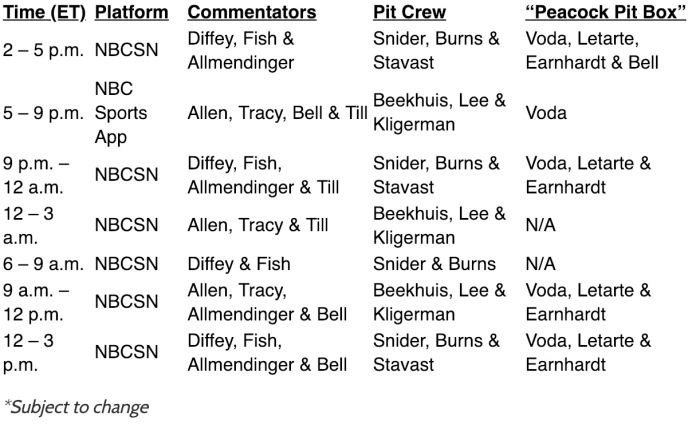 The network will utilize 17 of their IMSA, NASCAR, and IndyCar commentators, analysts, and reporters while providing 24-hour coverage from Daytona International Speedway. Leigh Diffey, Calvin Fish, and AJ Allmendinger will begin Saturday’s broadcast on NBCSN. See below for a full breakdown of assignments, platforms, and times.