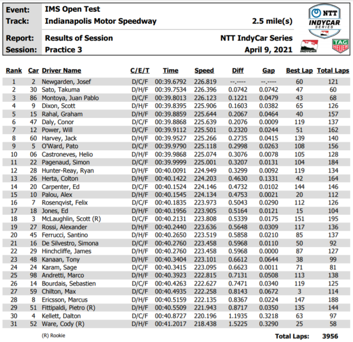 Josef Newgarden had the fastest time on the speed chart today at 226.819 mph. Two-time Indy 500 winners Takuma Sato and Juan Montoya were the only other two drivers to break the 226 mph barrier during the test. Newgarden has two championships on his resume, but clearly, his number one objective is to get his face on the Borg-Warner trophy.