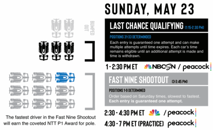 Last Chance Qualifying will allow drivers to make multiple attempts until 2:30 PM. The Fast Nine Shootout will be single runs in reverse order, meaning Dixon will be the final driver to qualify. In addition to the television coverage, all sessions will air on Peacock Premium. Once qualifying concludes and the 33-driver field is set, there will be a two-hour practice session beginning at 5 PM. This will be the final on-track activity before the two-hour practice session on Carb Day next Friday.