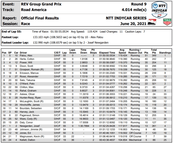 Palou pounced on the final restart as Newgarden suffered a mechanical issue, and went on to lead the final three laps for his second victory of the season. Palou is the first Chip Ganassi Racing driver other than Scott Dixon to win multiple races in a season since Dario Franchitti in 2011. The win also vaulted him back into the championship lead by 28 points with seven races remaining.