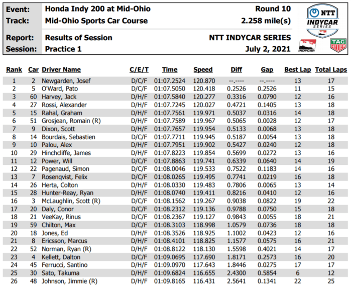 There will be another 45-minute practice session tomorrow morning at 9:05, followed by qualifying for the Honda Indy 200, which begins at Noon. Live coverage of qualifying will air on Peacock with a replay at 11 PM on NBC Sports Network.