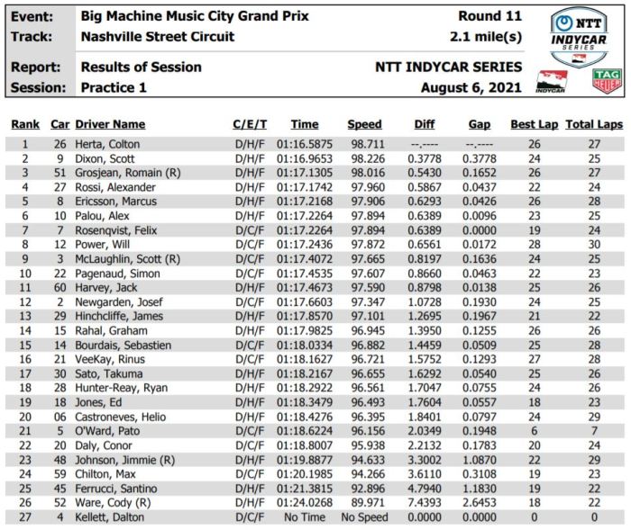 There will be one final 45-minute practice session tomorrow at 1 PM ET, followed by qualifying for the Big Machine Music City Grand Prix, which begins at 4:30 PM. Live coverage of qualifications is available on Peacock Premium.