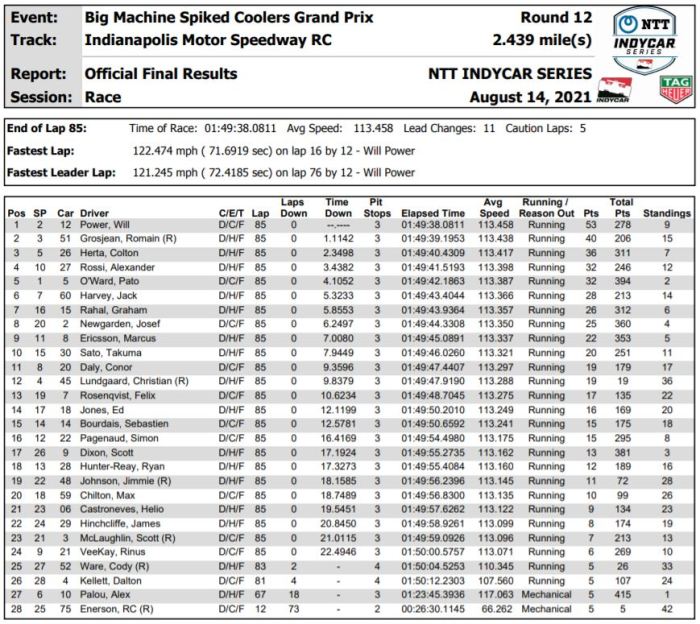 It was deja vu for Romain Grosjean, who has now finished 2nd in both of his starts on the IMS road course after his runner-up finish in early May. The Dale Coyne Racing driver was over the moon with the result, and being able to share it with his family. After a sour race last weekend in Nashville, Colton Herta rebounded nicely with a strong podium finish today. His Andretti teammate Alexander Rossi was just behind him in 4th, which was his best result of the season.