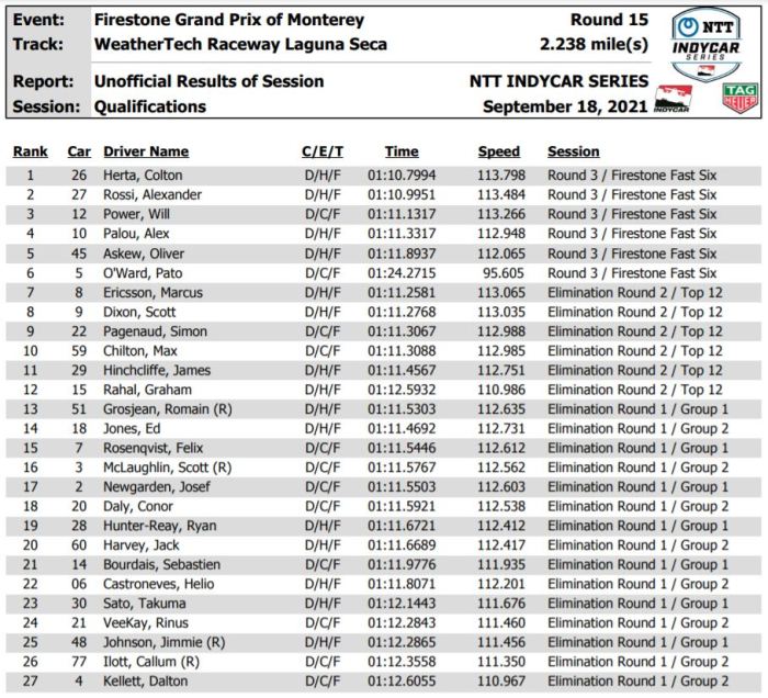 It will be an Andretti Autosport front row as teammate Alexander Rossi joins him up front. The driver of the No. 27 machine will start 2nd for the second consecutive weekend. He will look to improve on his runner-up finish from last weekend at Portland, still searching for his first win since Road America in 2019. The good news for these two is that 19 of the 23 races here have been won by a driver starting on the front row.