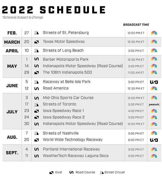 NBC Sports and IndyCar have announced the broadcast start times for the 2022 NTT IndyCar Series schedule, which will feature a record 14 races on broadcast network NBC, headlined by the 106th Running of the Indianapolis 500 presented by Gainbridge on Sunday, May 29 at iconic Indianapolis Motor Speedway, with coverage on NBC beginning at 11 a.m. (ET).