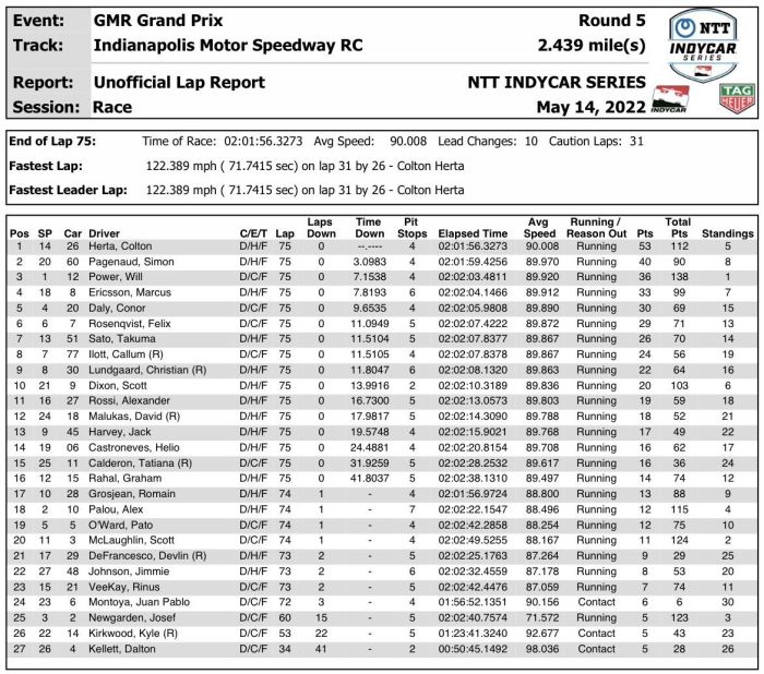 The biggest moment of the race came on Lap 16 when Josef Newgarden got tangled with Jack Harvey and Rossi. The result was the No. 2 Penske machine coming to a halt and not being able to continue. Newgarden’s 25th place finish was not exactly the momentum he and the team were looking for heading into Tuesday’s Indy 500 practice.