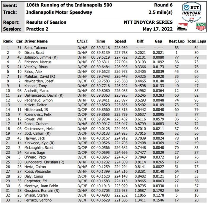 Two-time Indianapolis 500 winner Sato used the benefit of an aerodynamic tow on the 2.5-mile oval to lead the speed charts by more than 1 mph in the No. 51 Nurtec ODT Honda. Six-time NTT INDYCAR SERIES champion Scott Dixon was second at 227.768 in the No. 9 PNC Bank Chip Ganassi Racing Honda, leading four Chip Ganassi Racing drivers in the top six.