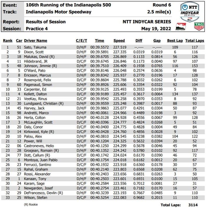 Rookie David Malukas, Sato’s teammate at Dale Coyne Racing, was third at 226.869 in the No. 18 HMD Honda. 2011 Indy 500 Rookie of the Year JR Hildebrand clocked in fourth at 226.846 in the No. 11 Homes For Our Troops/AJ FOYT RACING Chevrolet.