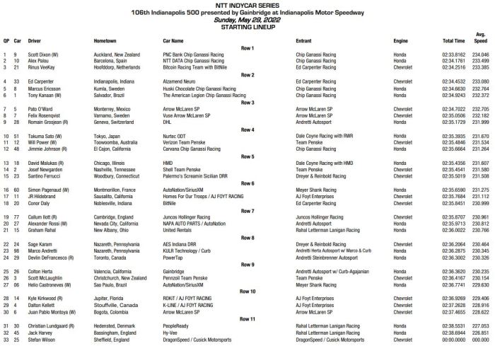 The fourth row features two-time Indy 500 winner Takuma Sato (10th) in the No. 51 Nurtec ODT Honda, 2018 Indy 500 winner Will Power (11th) in the No. 12 Verizon Team Penske Chevrolet and seven-time NASCAR Cup Series champion and “500” rookie Jimmie Johnson (12th) in the No. 48 Carvana Chip Ganassi Racing Honda.