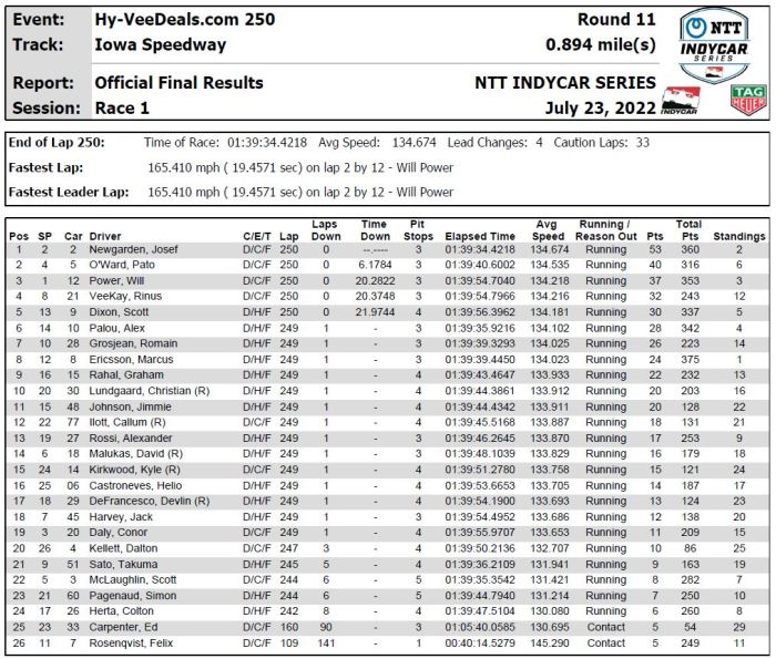 Two-time NTT INDYCAR SERIES champion Newgarden added this victory to his wins in 2016, 2019 and the second race of the Iowa doubleheader in 2020. He’ll get a chance to add to his win total at Iowa in the Hy-Vee Salute to Farmers 300 presented by Google at 3 p.m. ET Sunday, live on NBC and the INDYCAR Radio Network), starting second again behind teammate Power.