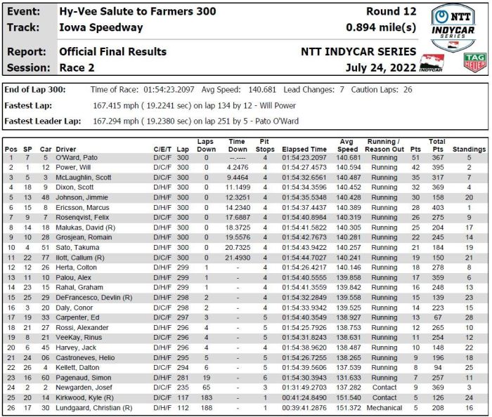 O’Ward won the Hy-Vee Salute to Farmers 300 presented by Google on Sunday at Iowa Speedway after Newgarden crashed out of the race with 65 laps remaining.