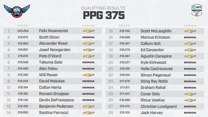 Alexander Rossi continued his strong start to the season with his new team, Arrow McLaren, by qualifying third at 219.960 in the team’s No. 7 Chevrolet. Reigning PPG 375 winner Josef Newgarden qualified fourth at 219.801 in the No. 2 PPG Chevrolet.