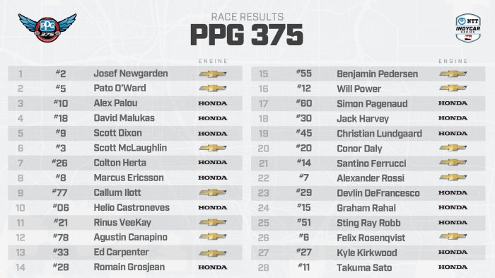 Newgarden drove his No. 2 PPG Team Penske Chevrolet past the No. 5 Arrow McLaren Chevrolet of Pato O’Ward for the lead on Lap 249 of the 250-lap speed carnival just moments before Romain Grosjean crashed in Turn 2 in the No. 28 DHL Honda, triggering the last of five caution periods and ending the race under yellow.