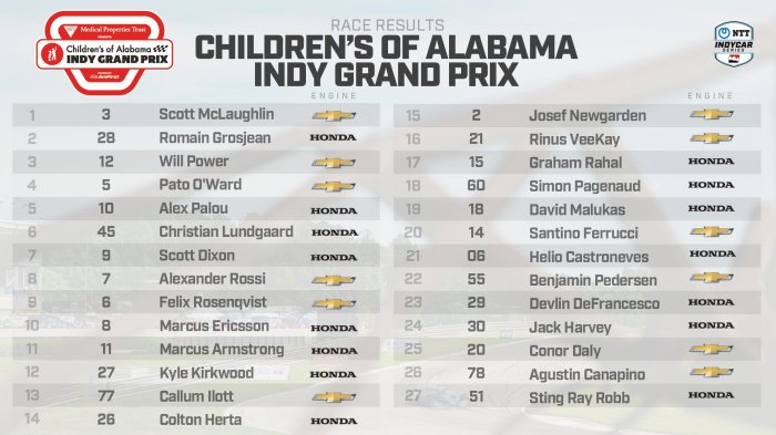 McLaughlin drove to his fourth career victory in the No. 3 Good Ranchers Team Penske Chevrolet by 1.7854 seconds over runner-up and NTT P1 Award winner Romain Grosjean in the No. 28 Delaware Life/DHL Honda. McLaughlin, from New Zealand, is the fourth different winner this season in as many races.