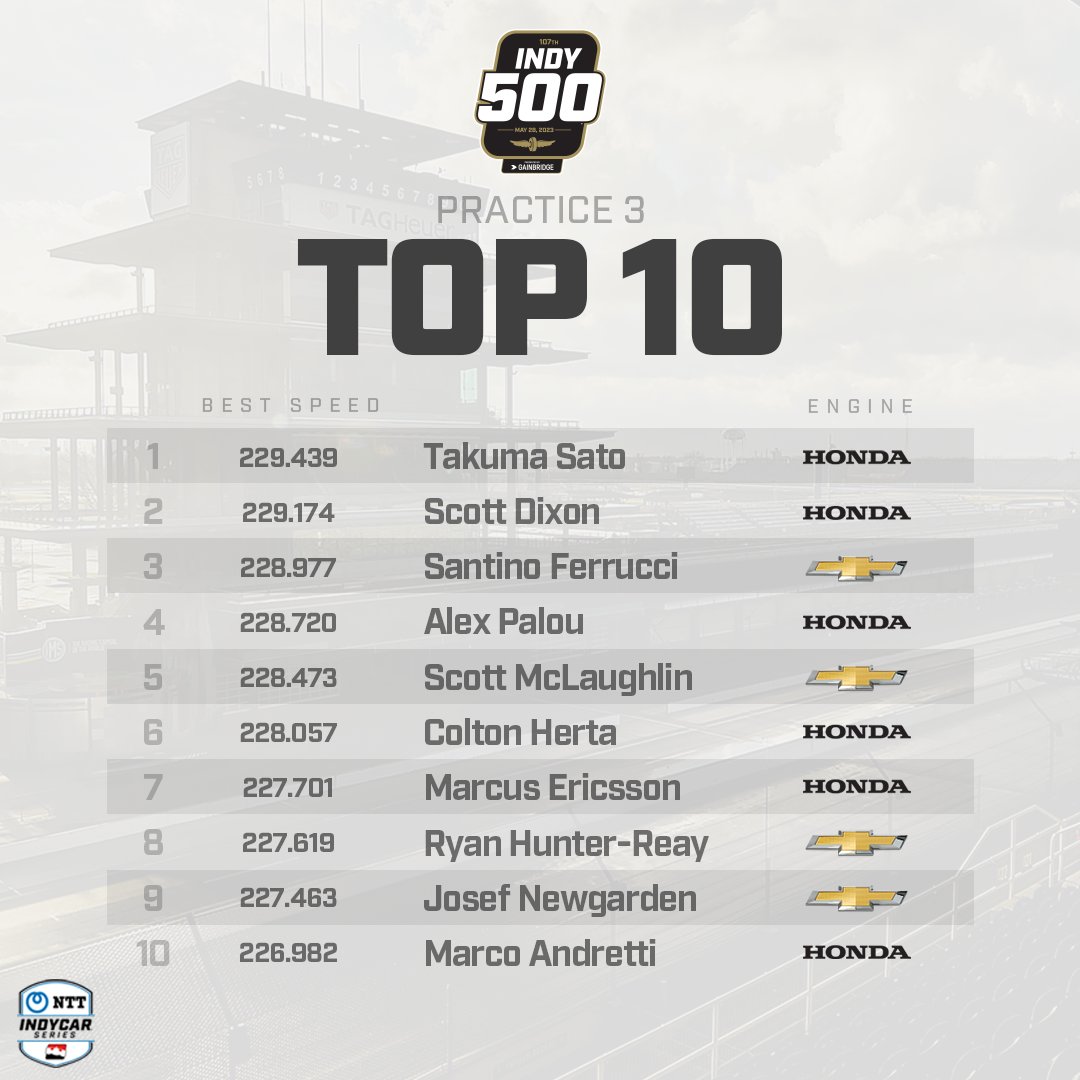 Scott McLaughlin was fifth at 228.473 in the No. 3 Pennzoil Team Penske Chevrolet. Reigning “500” winner Marcus Ericsson rounded out the four-car Chip Ganassi Racing team in seventh at 227.701 in the No. 8 Huski Ice Spritz Honda.