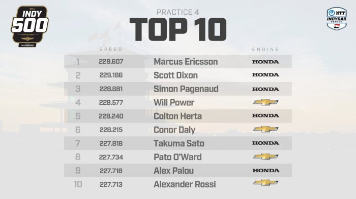 The top four drivers today all are past “500” champions, as 2019 winner Simon Pagenaud was third at 228.681 in the No. 60 AutoNation/SiriusXM Honda fielded by Meyer Shank Racing. 2018 winner and reigning series champion Will Power was fourth at 228.577 in the No. 12 Verizon Team Penske Chevrolet. Power also was second fastest on the “no-tow” list, running 224.283 alone on the 2.5-mile oval.