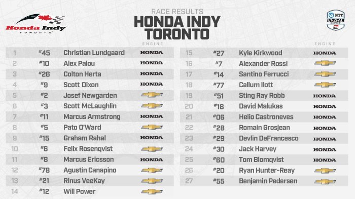 This was the first victory for Rahal Letterman Lanigan Racing since Takuma Sato won the Indianapolis 500 presented by Gainbridge in August 2020. The team’s last win on a temporary street circuit like the 11-turn, 1.786-mile course around Toronto’s Exhibition Place came in June 2017 when Graham Rahal swept the doubleheader on Belle Isle in Detroit.