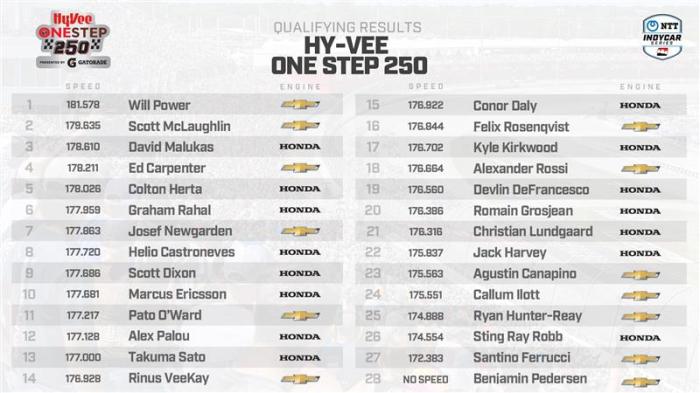 Power turned a lap of 181.426 mph in the No. 12 Verizon Team Penske Chevrolet on his first lap around the .894-mile oval, which set the starting grid for the Hy-Vee Homefront 250 presented by Instacart at 3 p.m. ET today (live on NBC, Peacock, INDYCAR Radio Network). His faster second lap of 181.578 earned the top spot for the Hy-Vee One Step 250 presented by Gatorade at 2 p.m. ET Sunday (live on NBC, Peacock, INDYCAR Radio Network).