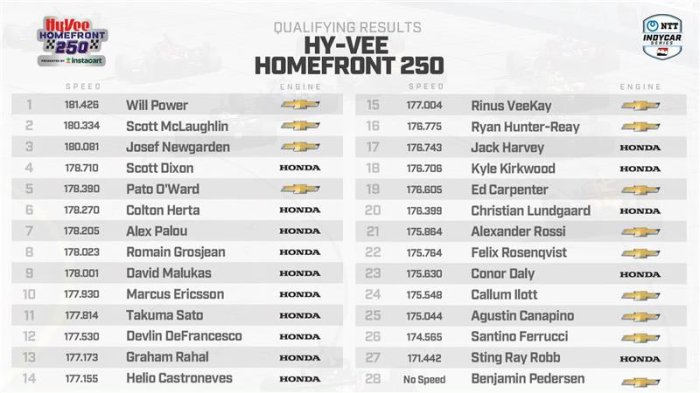 Power turned a lap of 181.426 mph in the No. 12 Verizon Team Penske Chevrolet on his first lap around the .894-mile oval, which set the starting grid for the Hy-Vee Homefront 250 presented by Instacart at 3 p.m. ET today (live on NBC, Peacock, INDYCAR Radio Network). His faster second lap of 181.578 earned the top spot for the Hy-Vee One Step 250 presented by Gatorade at 2 p.m. ET Sunday (live on NBC, Peacock, INDYCAR Radio Network).