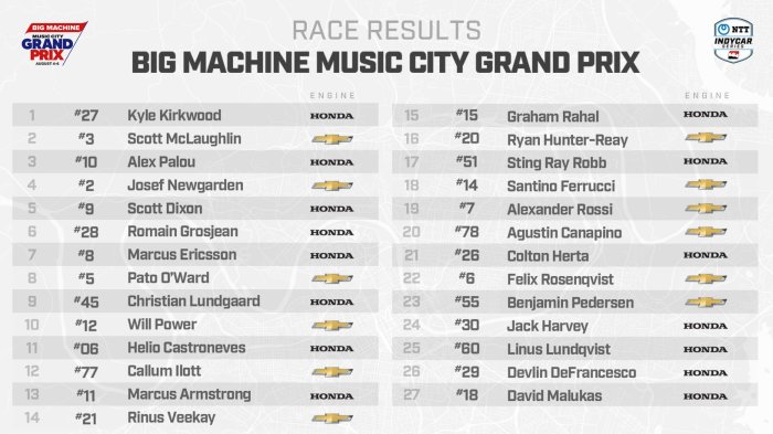 Championship leader Alex Palou finished third in the No. 10 The American Legion Honda of Chip Ganassi Racing. He expanded his lead to 84 points over closest pursuer and Nashville native Josef Newgarden, who placed fourth in the No. 2 PPG Team Penske Chevrolet.