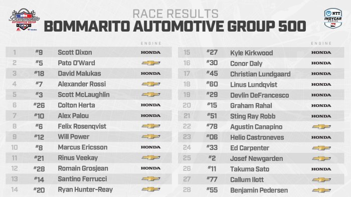 Pato O’Ward finished second in the No. 5 Arrow McLaren Chevrolet. David Malukas placed third in the No. 18 HMD Trucking Honda fielded by Dale Coyne Racing with HMD. O’Ward and Malukas were the only drivers on the lead lap with Dixon, whose margin of victory of 22.2256 seconds was the biggest for an INDYCAR SERIES race on the 1.25-mile WWTR oval.