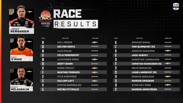 “I had a lot of fun today,” Newgarden said. “I think it’s so deserving for the work they (Team Penske) put in. We’ve worked really hard to close the gap. We didn’t have the speed we needed on road and street courses last year, at least on a consistency basis, and today we brought that speed. We had the execution, as always.”