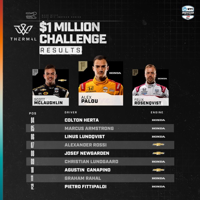 Reigning NTT INDYCAR SERIES champion Palou earned $500,000 for the victory in the non-points exhibition event at The Thermal Club, a private motorsports club near Palm Springs, California. Palou led all 20 laps of the Sprint for the Purse from the pole, driving his No. 10 DHL Chip Ganassi Racing Honda to a 5.7929-second victory over the No. 3 XPEL Team Penske Chevrolet of Scott McLaughlin, who earned $350,000 for his runner-up finish.