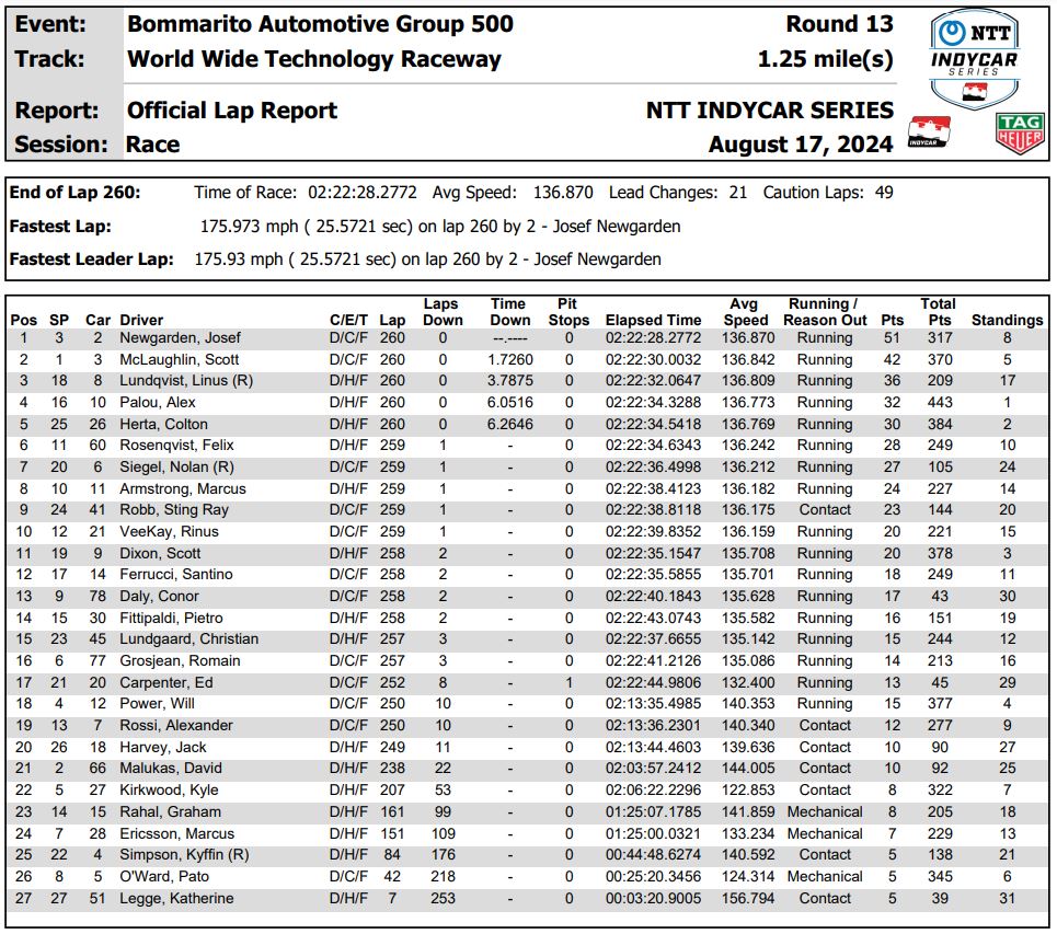 Herta had the fourth car across the finish line, but his No. 26 Gainbridge Honda of Andretti Global with Curb-Agajanian was later penalized one position for a blocking attempt on Lundqvist. That gave fourth place to Palou with Herta fifth. Still, Herta moved into second place in the standings.